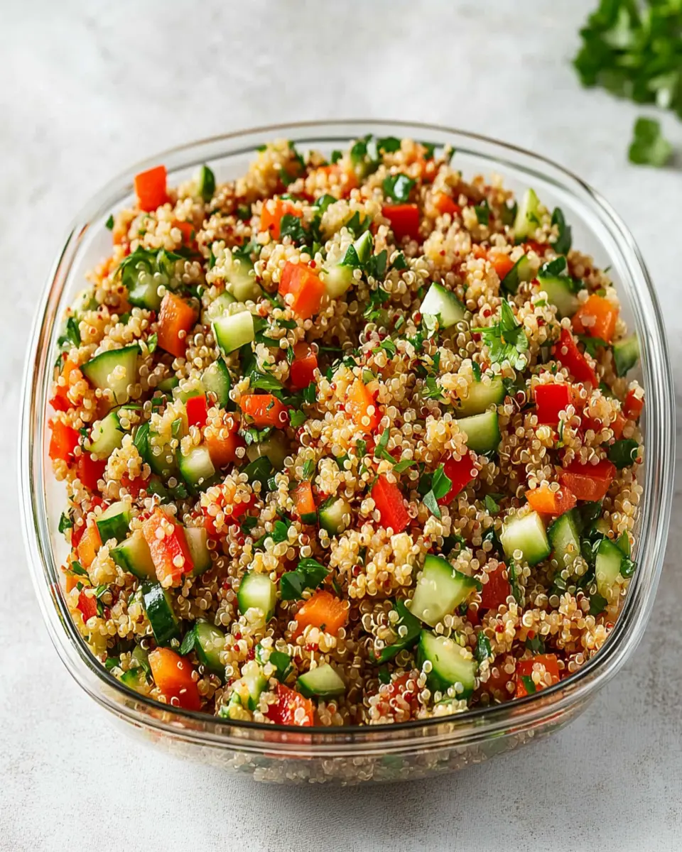 - In a large bowl, combine the cooked quinoa, cherry tomatoes, cucumber, red onion, bell pepper, and parsley.