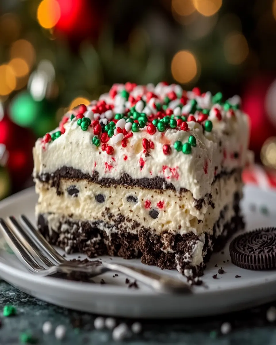 This No-Bake Christmas Oreo Lasagna is a delightful dessert that layers crushed Oreos, cream cheese, whipped topping, and chocolate pudding. Perfect for holiday gatherings!